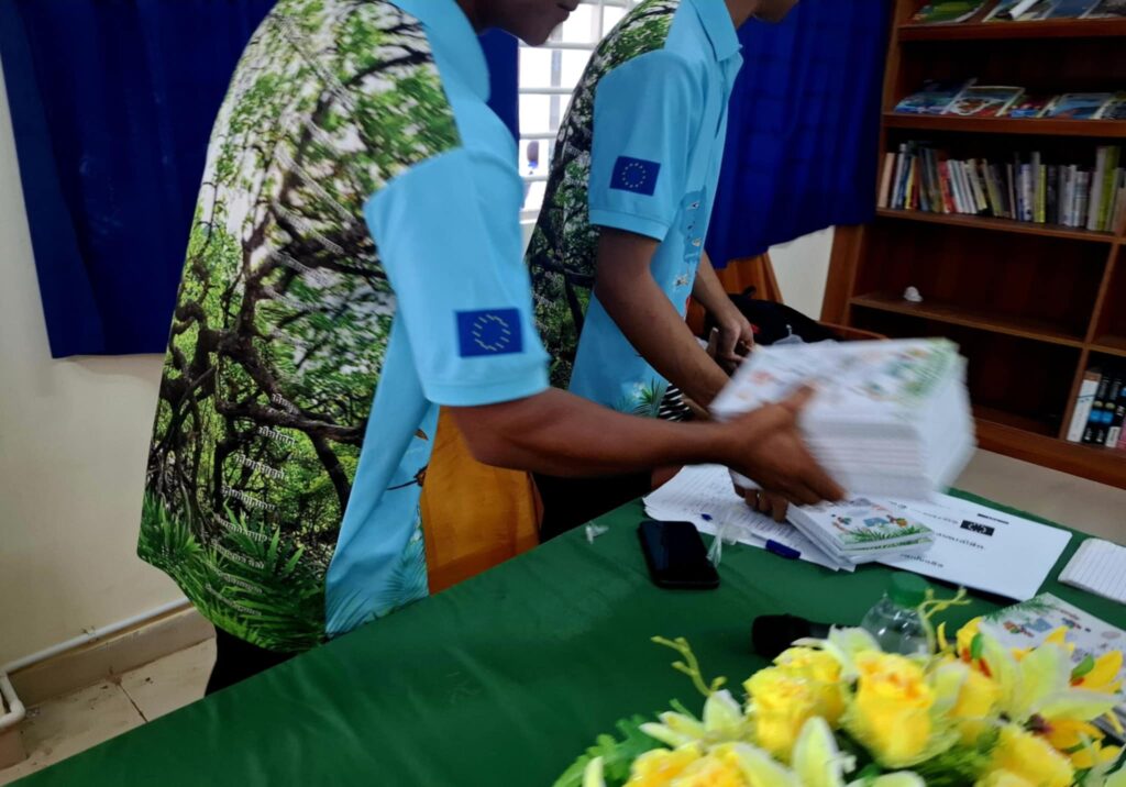 Photo: Nos Ziani distributes marine-themed notebooks, sharing the message of conservation with 18-year-old students.