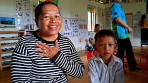 Nearby, four-year-old Srey Ni, whose parents work in a factory and construction, chimed in with joy: “My teacher is nice. She gives me food and she loves me!”