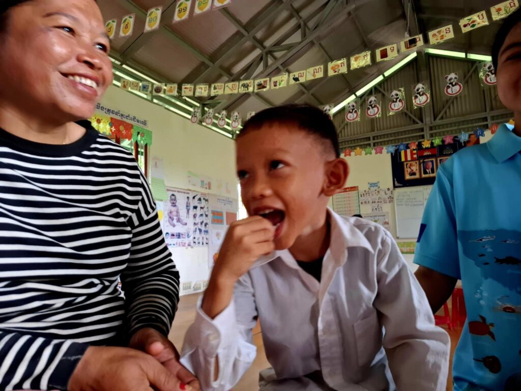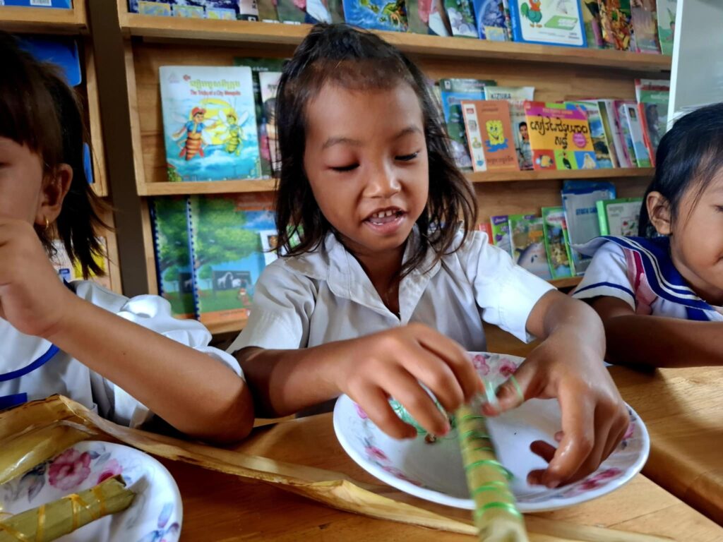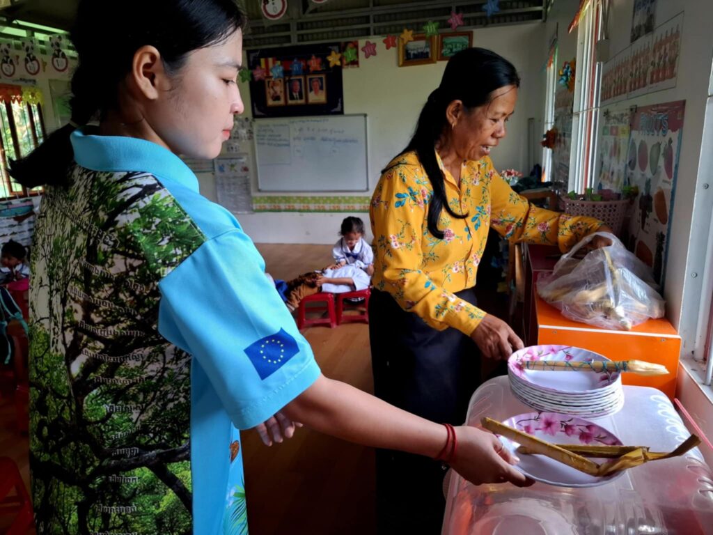 As the sun rose over the rice fields of Damnak Chang Eur this morning, the cheerful chatter of children filled the air at the local community preschool. By 8 o’clock, tiny hands were already reaching eagerly towards a neatly arranged table of food.
