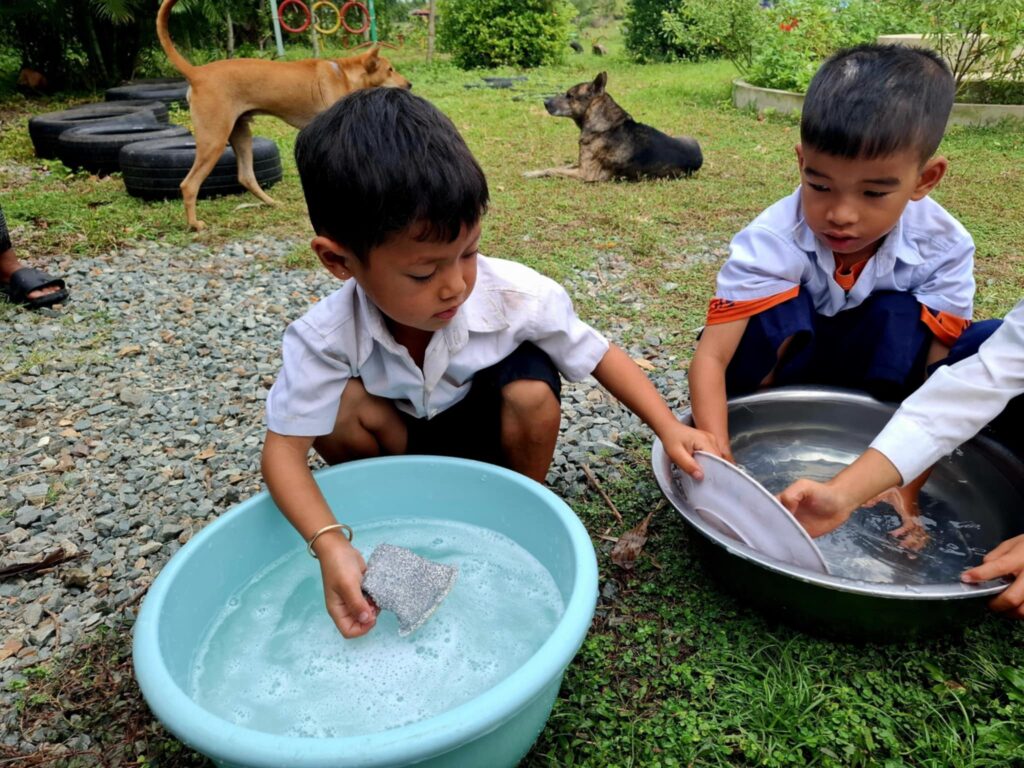 After breakfast, the children rushed to help their teacher with the dishes, laughing as they splashed in the water — small acts that build responsibility and joy.