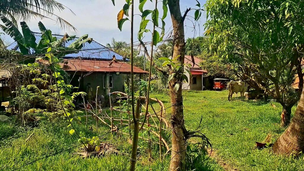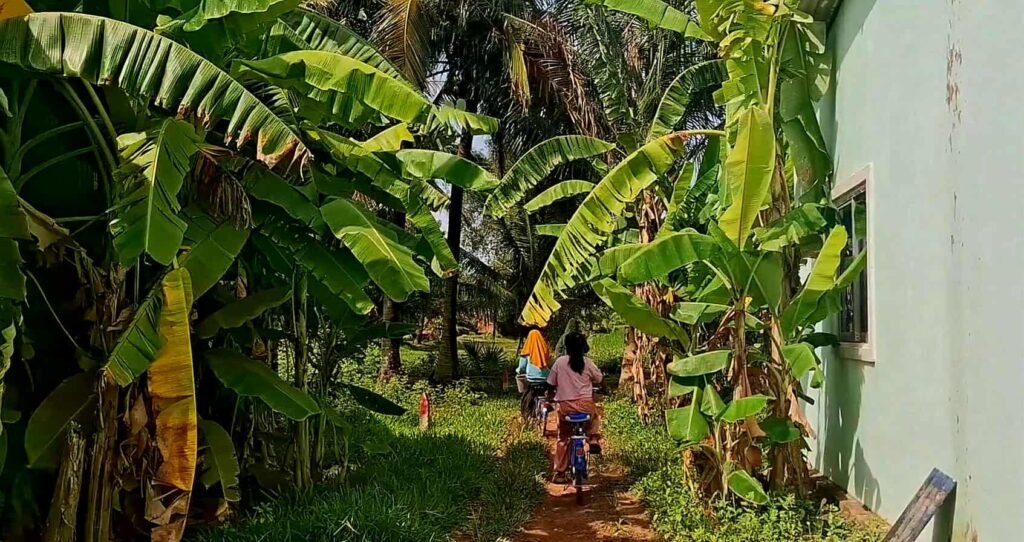 In Damnak Chang Eur village, in the coastal province of Kep, where rice fields shimmer under the sun and banana leaves sway in the breeze, children happily show us the way through quiet rural landscapes.
